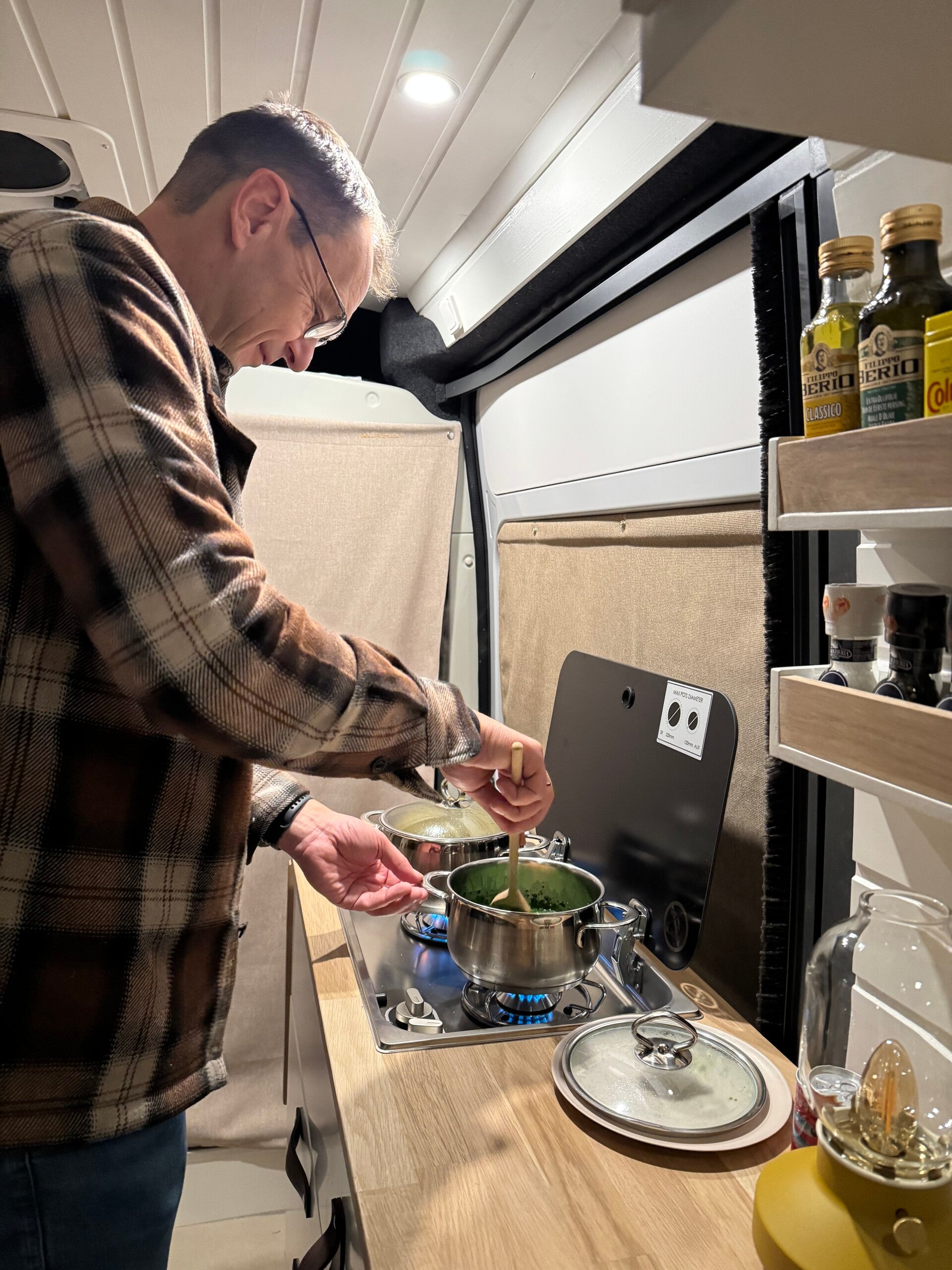 Alles werkt! We zijn superblij met het resultaat en vinden het fijn en huiselijk in ons kleine pipohuisje! We staan op de geitenboerderij, het is koud (geweest), maar binnen is het knus en behaaglijk warm. “Krek, dat is ‘t.” π