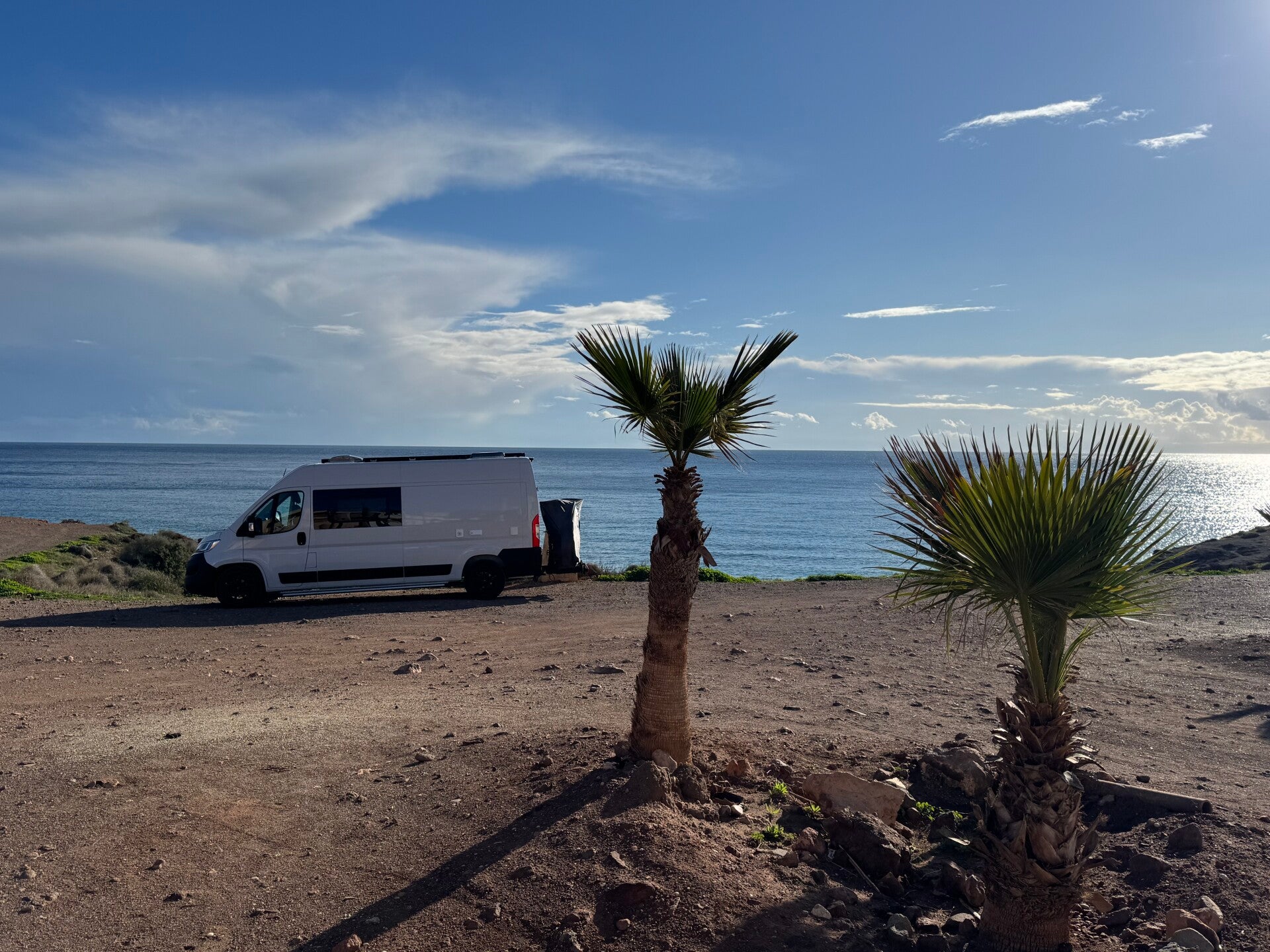 Het is leuk om af en toe zonder camping en stroom te staan. Je overnacht op dit soort prachtige plekken in de natuur, aan zee of staat juist midden in een dorp en het versterkt een enorm gevoel van vrijheid. De accu op het zonnepaneel werkt goed en voorziet ons in deze weersomstandigheden (genoeg zon) van voldoende stroom en warm water zolang als nodig. Maar na een paar dagen is het ook fijn weer een camping op te zoeken, zoals hier in Mojácar. Al is het maar voor een warme douche, om water te tanken, de lampjes weer gezellig op te hangen en op een stoel in plaats van een steen buiten te kunnen zitten 😉.