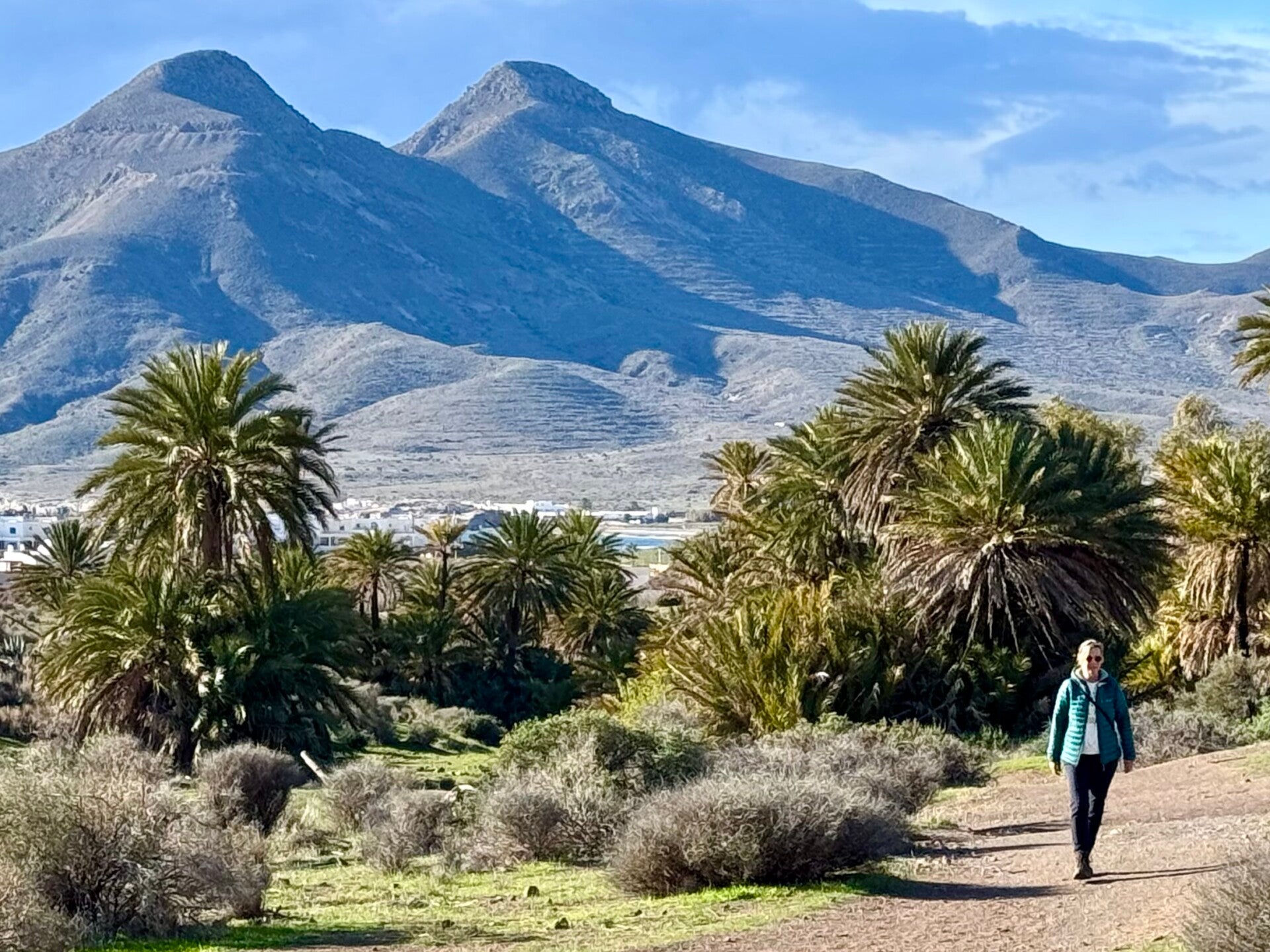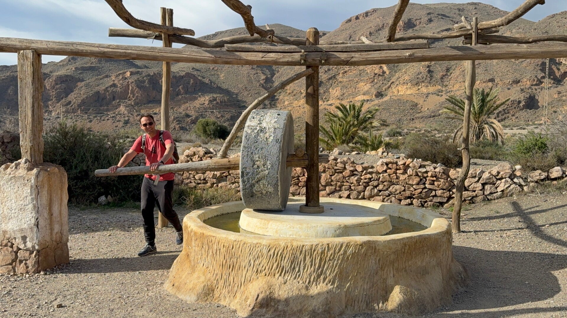 We staan 10 kilometer ten noorden van Almería vijf nachten op een kleine, landelijke camping tussen scharrelende pauwen en kippen, voor een bezoek aan de Tabernaswoestijn. Veel Amerikaanse westerns zijn ooit in dit landschap opgenomen. Nog altijd fungeert het als decor voor bijvoorbeeld de serie Game of Thrones. Er is een heus mini Hollywood als themapark dat je kunt bezoeken. Die slaan we even over. In plaats daarvan wandelen we vanaf de camping een stuk de woestijn in (lang leve Komoot voor mooie rondwandelingen) en stuiten min of meer bij toeval op een paar verlaten ‘dorpjes’. Dat wil zeggen: decorstukken van piepschuim en gevels van hout en gips. De achterkant laat zien dat het hier om decors gaat. Vreemd dat ze die zo laten vergaan. In ieder geval een bijzonder onwerkelijke gewaarwording om tussendoor te lopen!