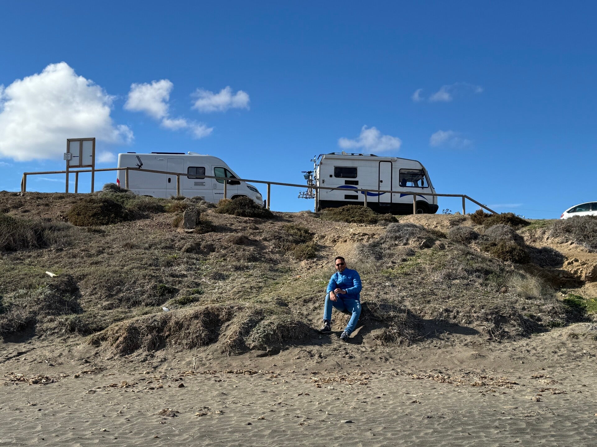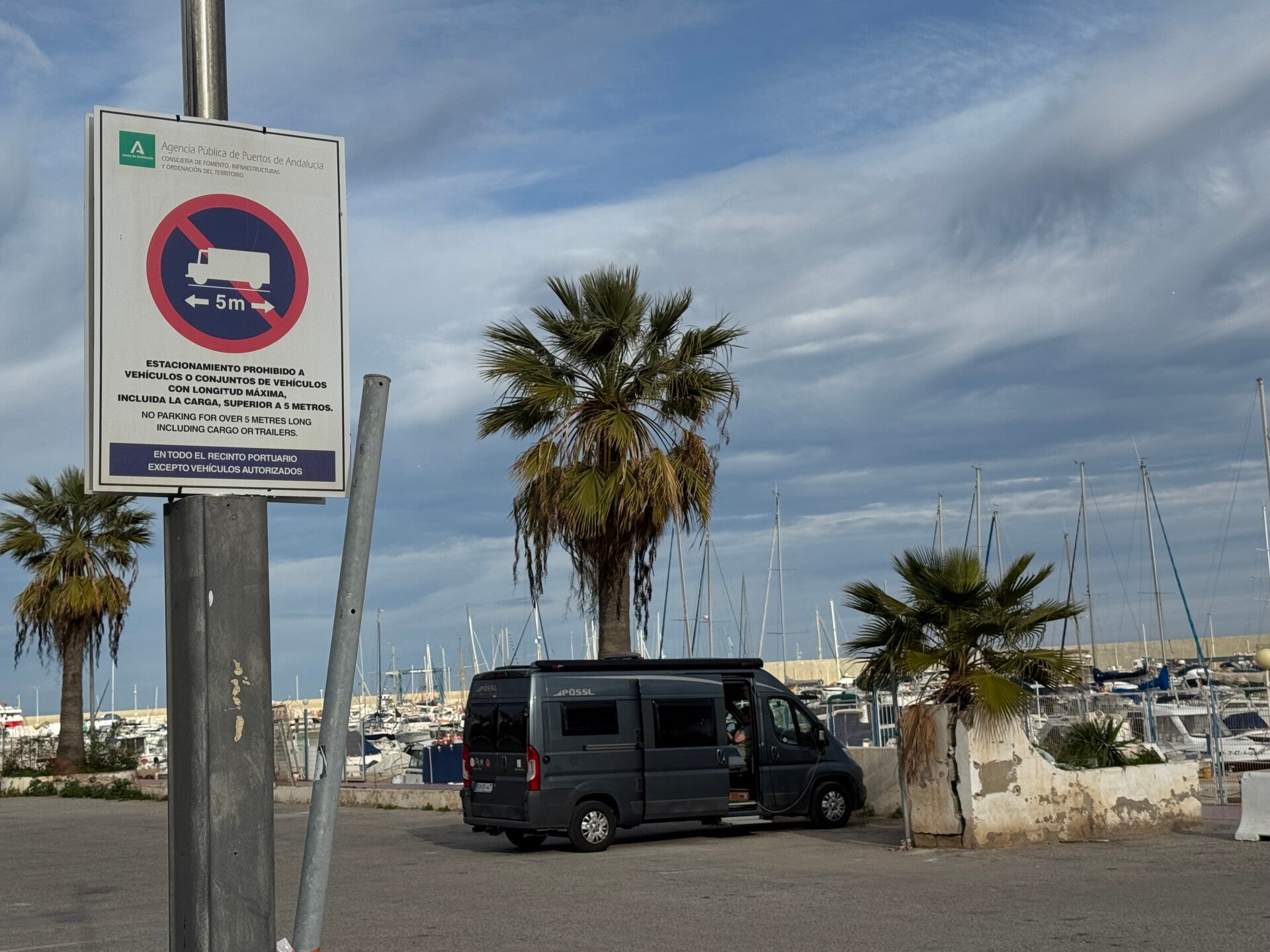 Soms zoeken we een overnachtingsplek buiten een camping. De Spaanse overheid gedoogt overnachtende camperaars in de winter. Voorwaarde is dat je geparkeerd staat en geen kampeeractiviteit laat zien: geen stoelen buiten; zelf een opstapje kun je beter niet buiten de deur zetten. Op de meeste grote parkeerterreinen sta je gratis. In de zomer word je als camperaar juist ontmoedigt op deze terreinen te staan door een stellage met hoogtebeperking (die nu zijn ‘weggedraaid’) of een verbodsbord voor voortuigen langer dan 5 meter.